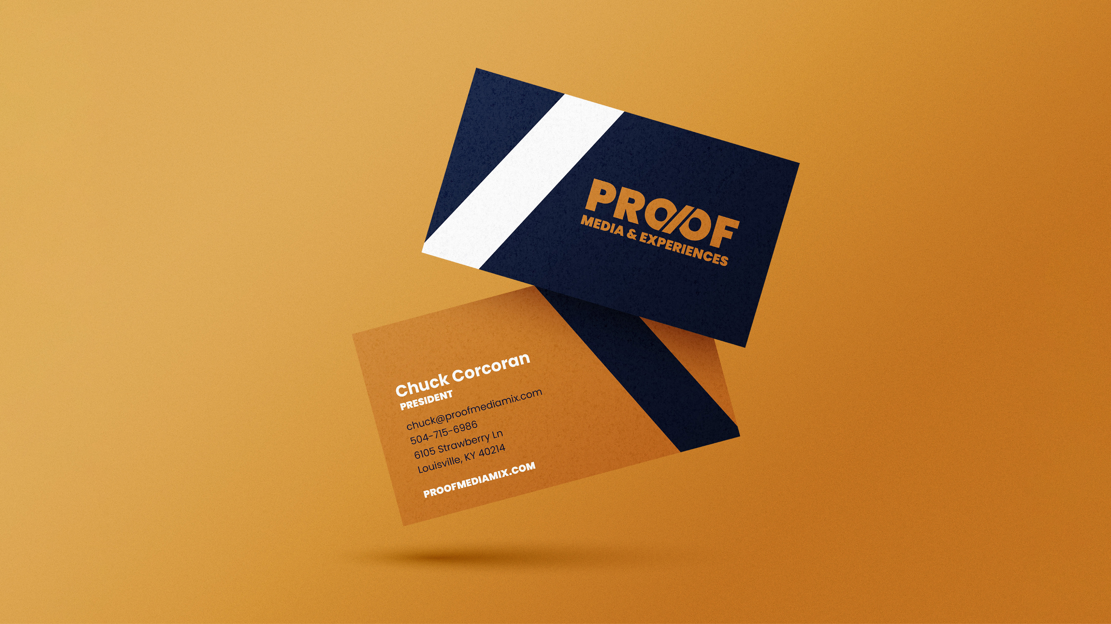 The full brand system includes the company's updated name "Proof Media and Experiences," a rich color palette anchored by deep navy and warm bourbon tones, a Poppins-based typography suite, and business card designs that bring the new identity to life across print touchpoints.